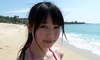 باریک, دختر چینی Tsukasa آرای ambles بر روی یک ساحل شنی در زیر آفتاب