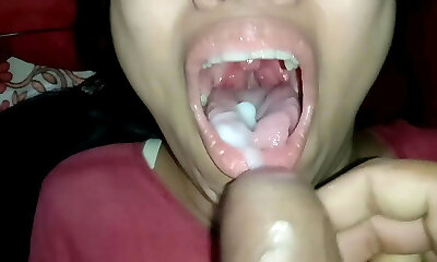 Wife gives blowjob and gets cum in mouth