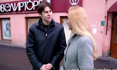 Blonde with tattoo and yam-sized milkings on a bed having sex with a black m...